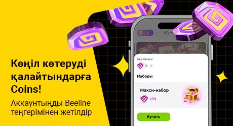 2024 жылдың 29 желтоқсанына дейін «Менің Beeline-ым» қосымшасында 499 ₸ Coins жиынтығын мобильді теңгерімнен сатып алып, ақшалай сыйлықтар ұтысына қатысыңыз.