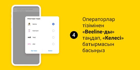 Операторлар тізімінен "Beeline"-ды таңдап, "Әрі қарай" батырмасын басыңыз;