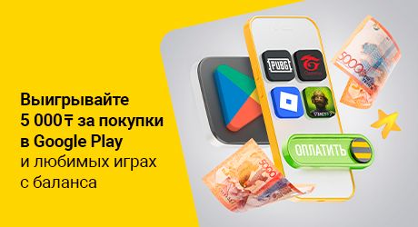 Представьте, что Вы на пороге выигрыша. Теперь каждое Ваше игровое приключение с покупкой в Garena Free Fire, Roblox, PUBG, Standoff и многие других играх, в играх в Janymda и Simply или покупка в Google Play может принести реальные деньги. Выиграйте 5000 тенге, шанс есть каждую неделю!